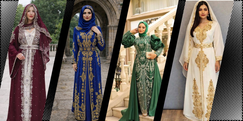 Embroidered or silk kaftan dresses may also be used by the brides at weddings, parties and festive occasions with high heights and glamorous accessories.