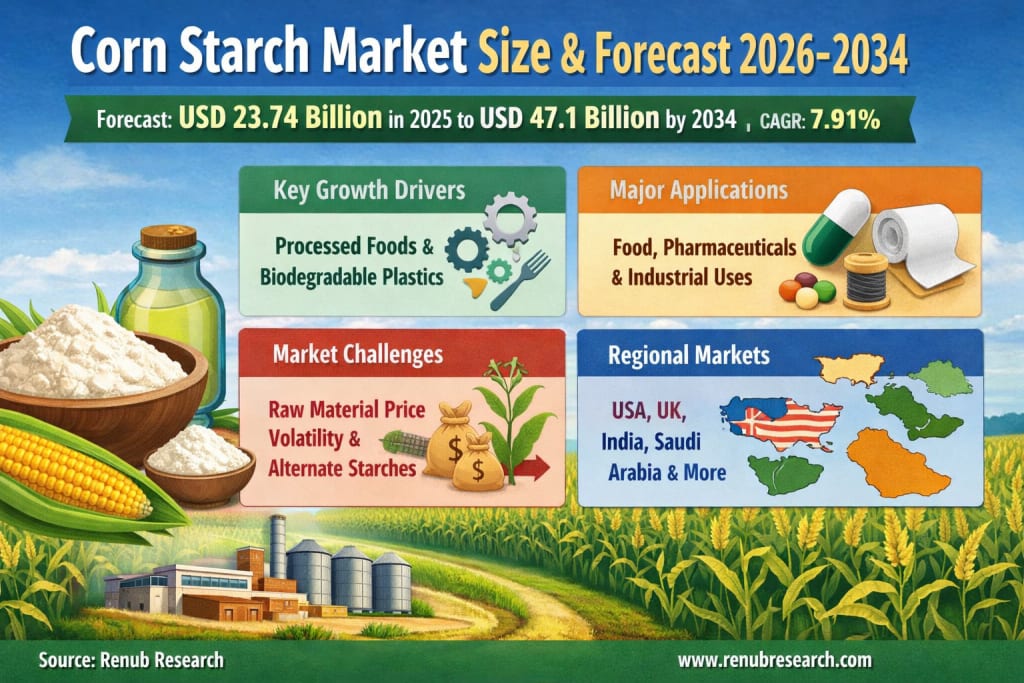 The global Corn Starch Market is witnessing significant expansion as industries increasingly rely on plant-based ingredients for food processing, pharmaceuticals, and industrial applications. According to Renub Research, the market is projected to grow from US$ 23.74 Billion in 2025 to US$ 47.1 Billion by 2034, registering a compound annual growth rate (CAGR) of 7.91% from 2026 to 2034.