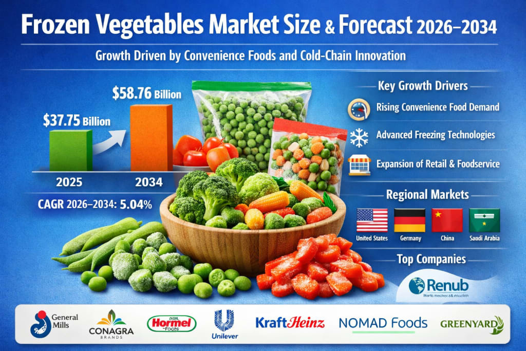 The global frozen vegetables market is entering a period of consistent expansion as consumers increasingly prioritize convenience, nutrition, and year-round food availability. According to insights from Renub Research, the Frozen Vegetables Market is expected to reach US$ 58.76 billion by 2034, rising from US$ 37.75 billion in 2025, growing at a compound annual growth rate (CAGR) of 5.04% between 2026 and 2034.