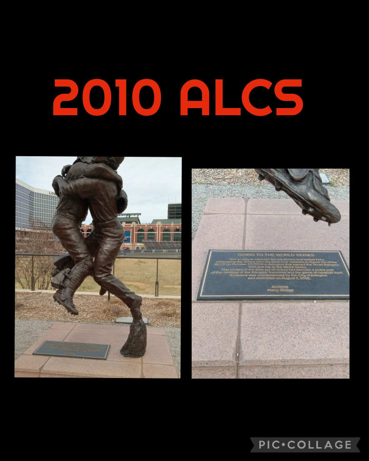This statue displays Neftalí Feliz and Bengie Molina celebrating the Rangers winning the American League pennant in 2010, heading to their first World Series. If you're not familiar of who Bengie Molina was, he's the brother of two-time World Series champion Yadier Molina, who won both titles with the St. Louis Cardinals in 2006 and 2011.
